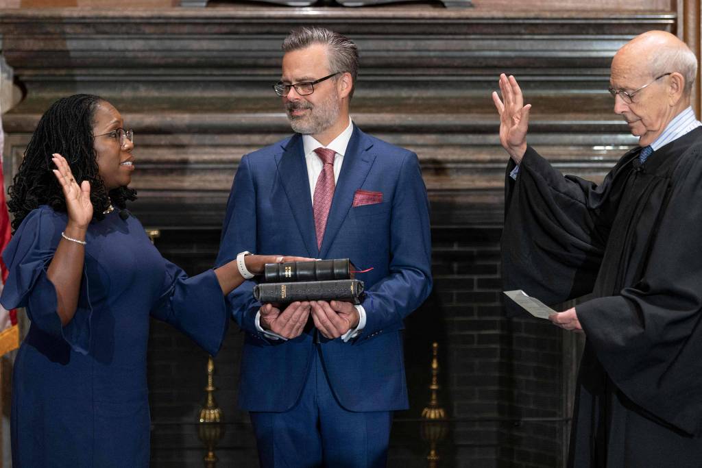 Jackson, 51, fez o juramento e foi empossada no cargo por volta das 12h (13h em Brasília). Ela prometeu defender a Constituição dos EUA e a administrar a Justiça de modo impessoal e imparcial e não discursou no evento, que durou poucos minutos e foi realizado dentro da Suprema Corte. A magistrada terá um mandato vitalício, assim como os outros oito integrantes do tribunal.