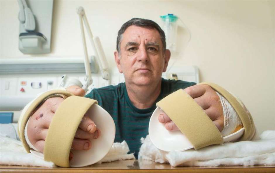 Um homem de 57 anos se tornou a primeira pessoa do Reino Unido a receber um duplo transplante de mãos após perder estas extremidades em um acidente de trabalho há três anos, informaram nesta sexta-feira os meios de comunicação britânicos.