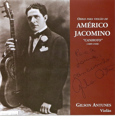 “Nascido em São Paulo, em 12 de fevereiro de 1889, Américo Jacomino cresceu num ambiente bastante cosmopolita. Filhos de imigrantes italianos, Jacomino começou a tocar violão influenciado por seu irmão mais velho, Ernesto, que também lhe deu aulas de bandolim. Américo recebeu o apelido que o deixaria célebre, CANHOTO, por tocar violão com a mão esquerda sem inverter as cordas do instrumento. Em 1912 Américo Jacomino começou a gravar pela Odeon em São Paulo e Rio de Janeiro, tocando violão solo ou com seu Grupo do Canhoto, um tipo de grupo seresteiro. Em 1916 ele debutou no Conservatório Dramático e Musical de São Paulo, recebendo a primeira aclamação de público e crítica.
