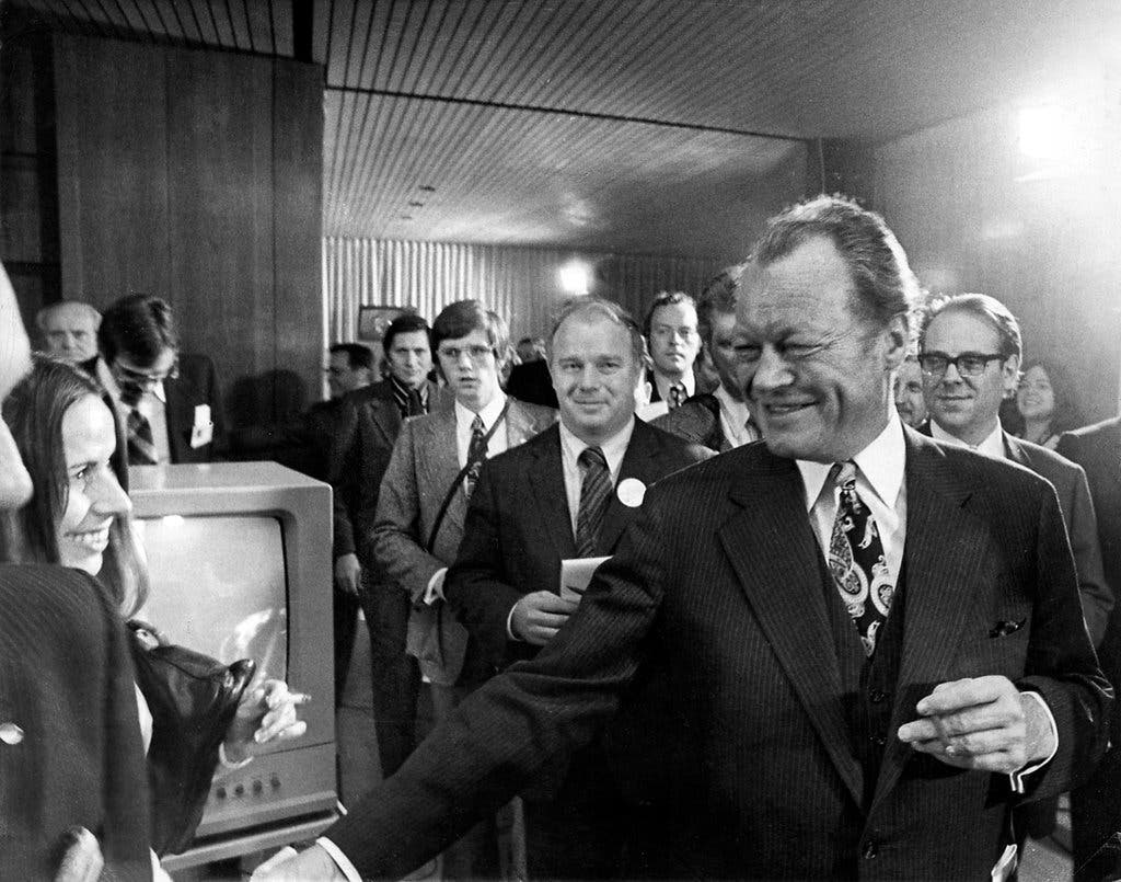 Sr. David Binder, caderno na mão, atrás de Willy Brandt, o chanceler da Alemanha Ocidental, após a reeleição do Sr. Brandt em 1972. Entre os muitos livros que o Sr. Binder escreveu estava “The Other German: Willy Brandt’s Life and Times”, publicado em 1976. (Crédito da fotografia: cortesia Agência de Imprensa Alemã)