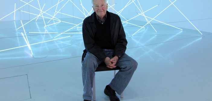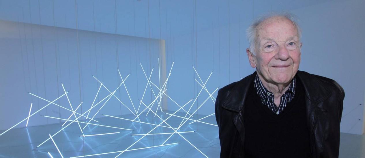 François Morellet à frente de uma instalação com tubos de luz no Centro Pompidou, que abrigou em 2011 uma retrospectiva de sua obra – (Foto: PIERRE VERDY / AFP)