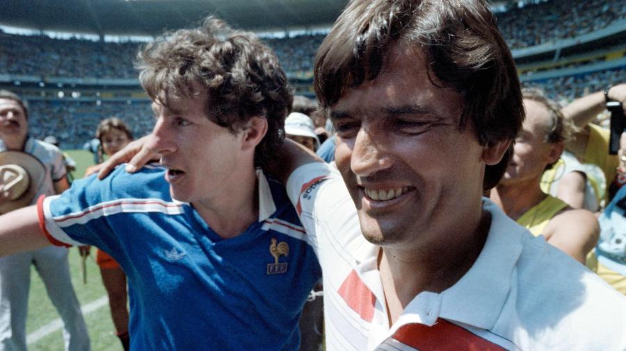 Henri Michel (direita) festeja vitória da França sobre o Brasil nas quartas de final da Copa de 1986 (Imagem: AFP)