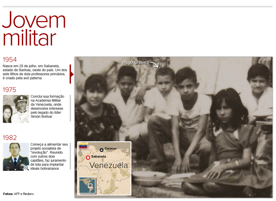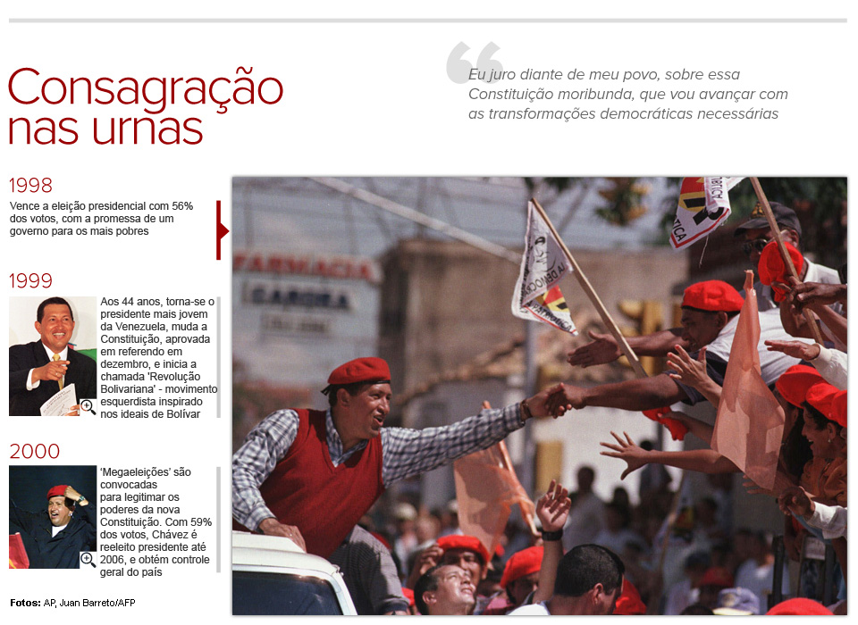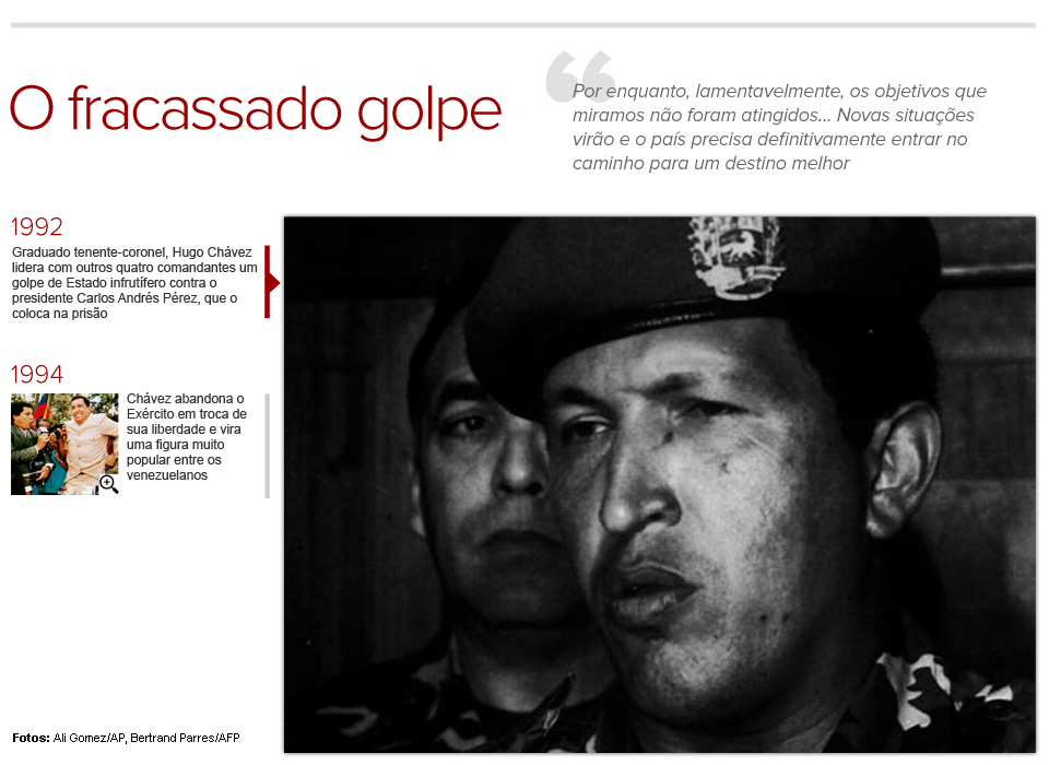 Militar reformado, Chávez entrou para a política depois de uma fracassada tentativa de golpe de Estado que o levou à prisão, em 1992.