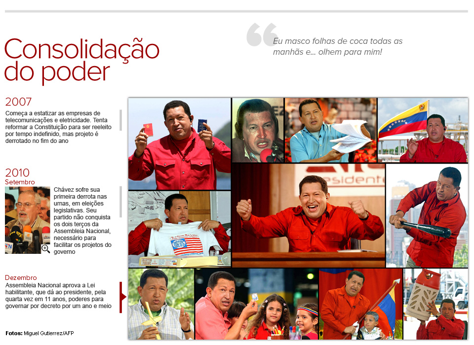 Além de ser comandante-em-chefe das Forças Armadas e presidente do Partido Socialista Unido da Venezuela (PSUV), com maioria na Assembleia Nacional, Hugo Chávez também controlava a mídia estatal.