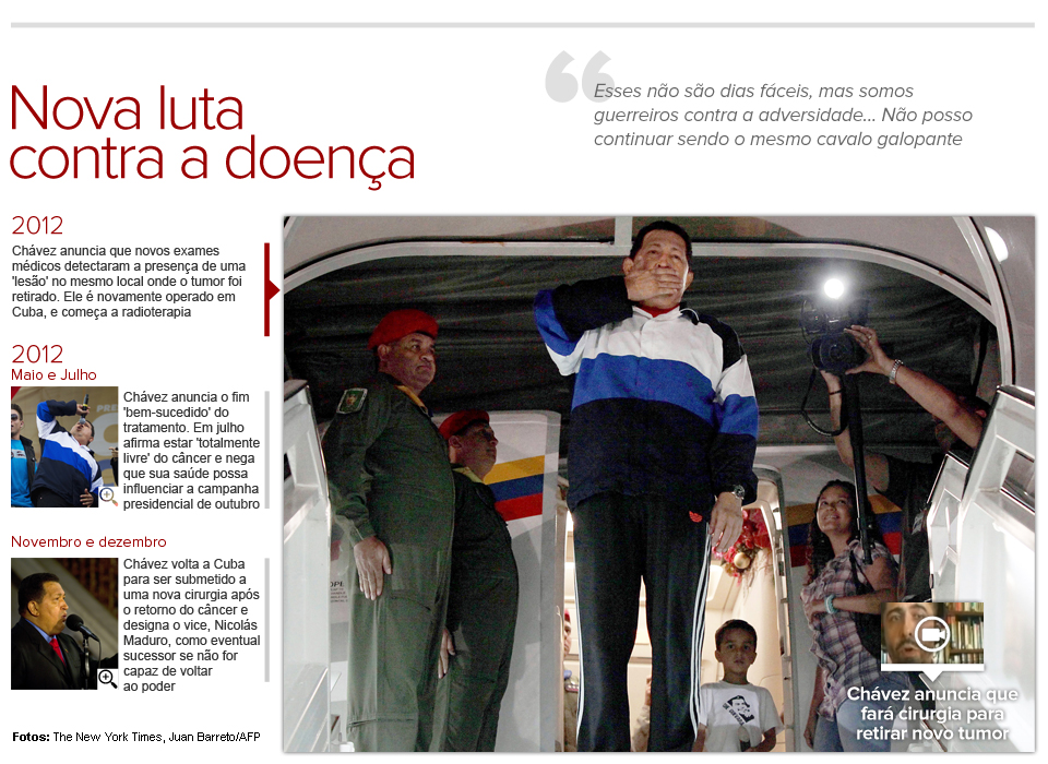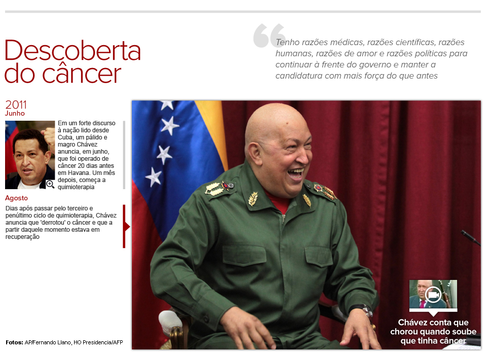 Em julho, quando era candidato à reeleição, o presidente voltou a dizer que havia vencido a batalha contra o câncer. Aos opositores, Chávez dizia que seus problemas de saúde não o impediriam de vencer a eleição que poderia mantê-lo no poder até 2019.