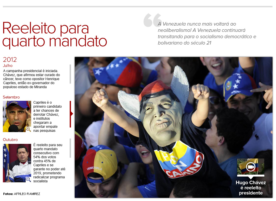 Em 7 de outubro, Chávez derrotou Henrique Capriles Radonski, mesmo com uma campanha limitada, e garantiu novo mandato, o quarto consecutivo, até 2019, prometendo “radicalizar” o programa socialista que vinha implantando no país.