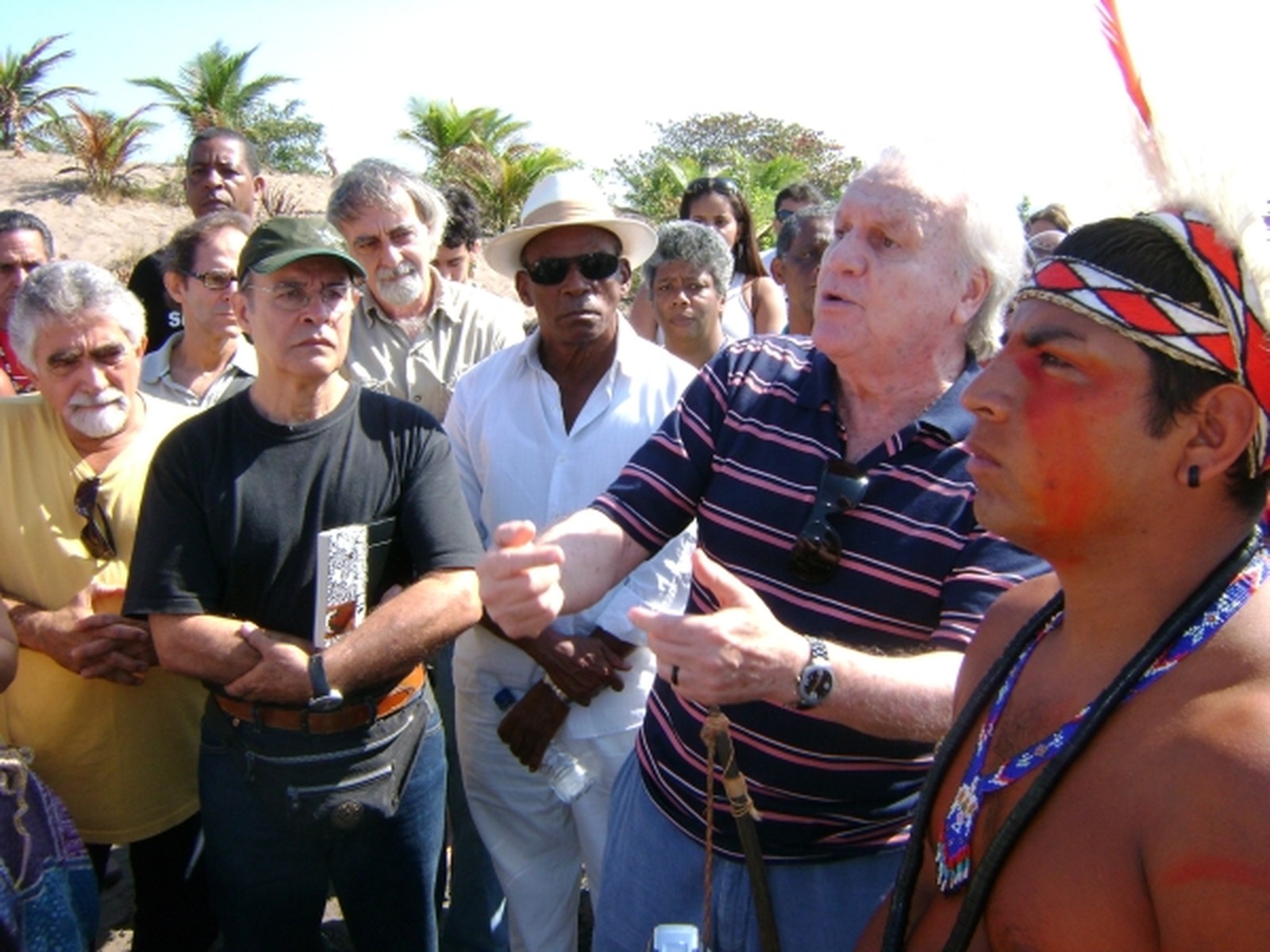 João Luiz Duboc Pinaud em homenagem aos povos indígenas, acompanhado pelos atores Osmar Prado e Antônio Pitanga. (Foto: Reprodução/ Joaoluizpinaud.com)