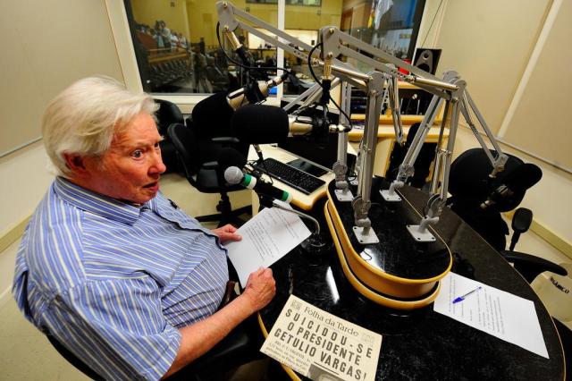 Em 2012, Lauro recriou, 58 anos depois do fato, a divulgação da notícia da morte de Getúlio Vargas no microfone dos estúdio da Rádio Câmara, em Porto Alegre (Foto: Leo Contursi / Divulgação)