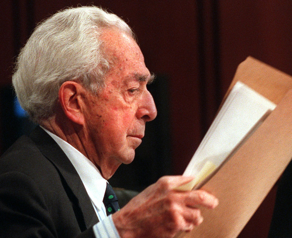 ** ARQUIVO ** O ex-conselheiro da Casa Branca Lloyd Cutler repassa notas antes de testemunhar perante o Comitê Whitewater do Senado no Capitólio nesta foto de arquivo de 9 de novembro de 1995. Cutler, que serviu como conselheiro da Casa Branca para os presidentes Carter e Clinton. (AP Photo/Dennis Cook, Arquivo)