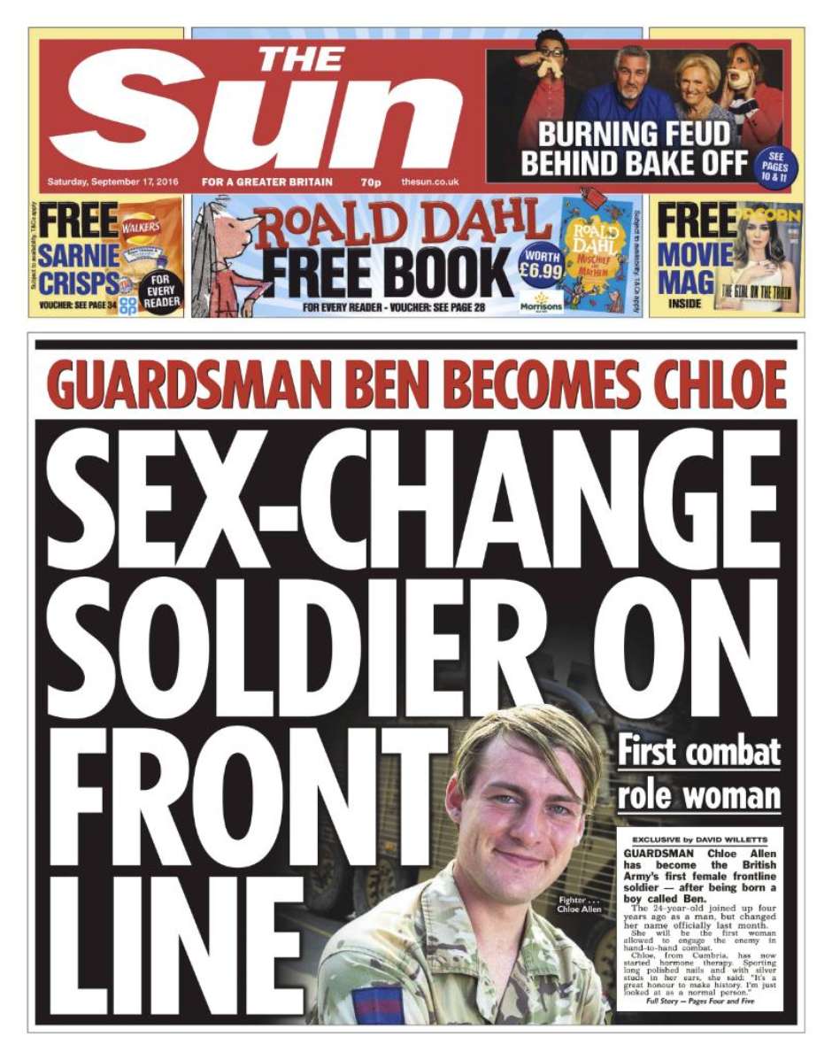 Uma soldada transgênera, de 24 anos, se tornou a primeira mulher a servir na linha de frente do Exército britânico. Natural de Cúmbria, no nordeste da Inglaterra, Chloe Allen entrou para as Guardas Escocesas como homem em 2012, mas iniciou um tratamento de terapia hormonal em agosto de 2016, e mudou oficialmente seu nome.