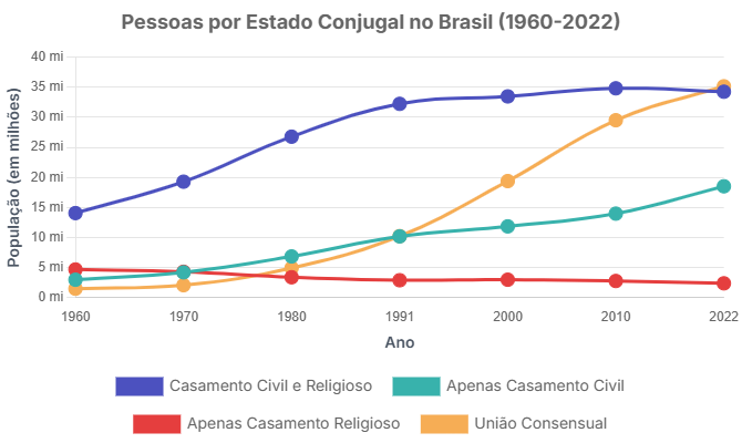 No período de 2000 a 2022, o levantamento mostra que somente as uniões consensuais e o casamento apenas no civil cresceram. As uniões consensuais tiveram seu grande aumento entre 2000 (28,6%) e 2010 (36,4%), com uma redução do ritmo de crescimento de 2010 para 2022, quando chegou a 38,9%. Já o casamento só no civil, era 17,5% em 2000, caiu para 17,2% em 2010 e voltou a crescer em 2022, ficando em 20,5%.
