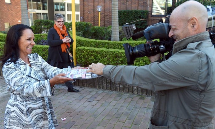 Linda Burney oferece um chocolate a um cinegrafista antes de uma coletiva de imprensa – (Foto: STRINGER / REUTERS)