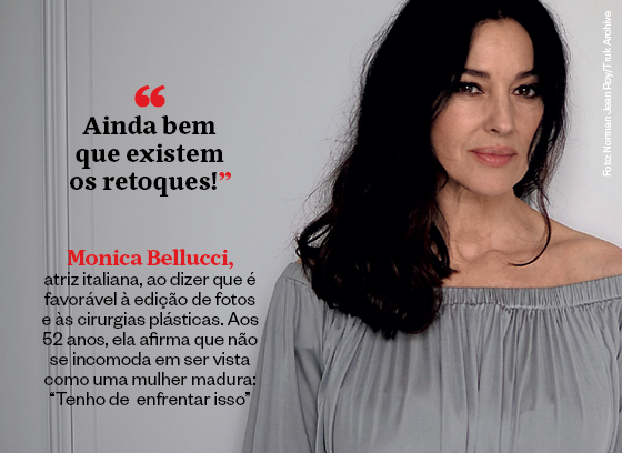Monica Bellucci, atriz italiana, conhecida internacionalmente por seus filmes na Europa e em Hollywood, ao dizer que é favorável à edição de fotos e às cirurgias plásticas. Aos 52 anos, ela afirma que não se incomoda em ser vista como uma mulher madura: ‘Tenho de enfrentar isso’