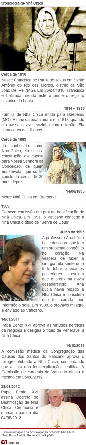 O reconhecimento de um milagre atribuído a Nhá Chica foi assinado em junho do ano passado pelo então papa Bento 16. O decreto encerrou o processo de beatificação, último passo antes da santificação.