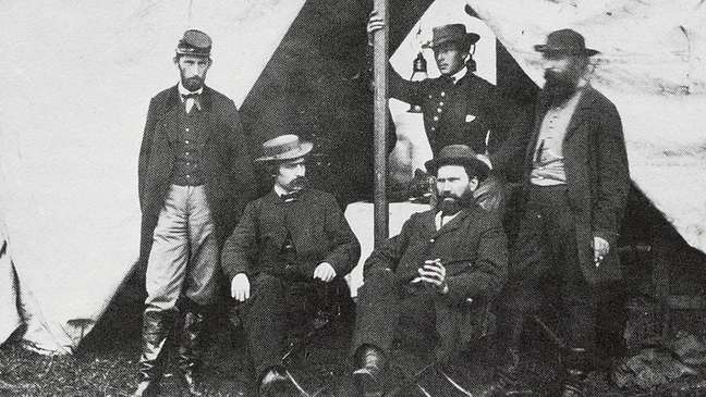 Alan Pinkerton, fundador da Agência Pinkerton, e sua equipe. Kate Warne está de pé, apoiando-se no poste