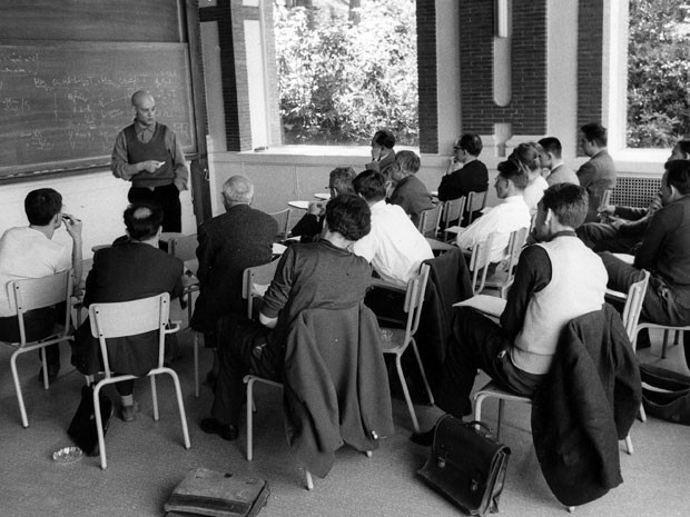 Foto divulgada pelo High Scientific Studies Institute mostra o matemático Alexandre Grothendieck lecionando em Paris, na década de 1960 (Foto: AP Photo/IHES)