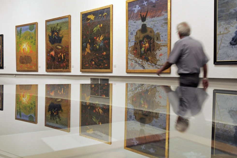 ARQUIVO – Na terça-feira, 22 de junho de 2010, foto de arquivo que homem caminha em frente às pinturas do artista austríaco-israelense Arik Brauer, conhecido por suas pinturas e murais coloridos e surreais na exposição ‘Arte Fantástica de Viena’ no museu Panorama em Bad Frankenhausen, Alemanha central. (Foto AP/Jens Meyer, arquivo)