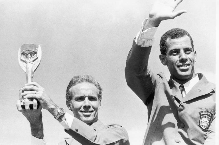 Zagallo, técnico do Brasil, segurando a Taça Jules Rimet, ao lado do capitão Carlos Alberto, durante desfile em carro aberto, na comemoração da conquista da Copa do Mundo de Futebol – 1970 (/Dedoc)