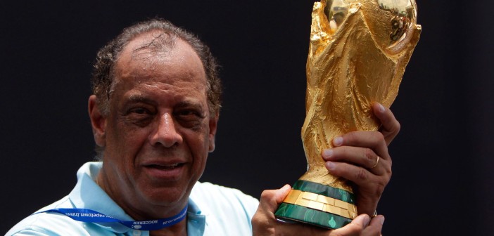 No tour da Taça Fifa antes da Copa de 2014, realizada no Brasil, Carlos Alberto Torres repetiu o beijo que dera na Jules Rimet em 1970. Capitão ganhou títulos como jogador e técnico (Foto: Gaspar Nobrega / Inovafoto Divulgação)