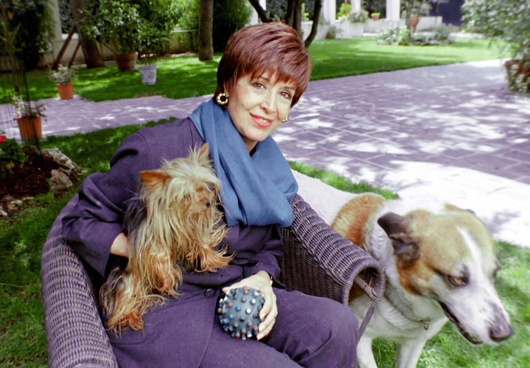 A atriz espanhola Concha Velasco posa com seus cães Leo e Hutch em sua casa em Madrid em 15 de maio de 2000 (© Rafa RIVAS)