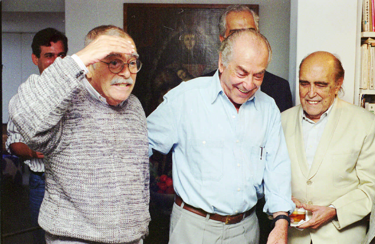 Darcy Ribeiro é acompanhado por Leonel Brizola (centro) e Oscar Niemeyer (à direita) no lançamento da Fundação Darcy Ribeiro, em seu apartamento em Copacabana (abr.1995 – Foto: Luciana Whitaker/Folhapress)