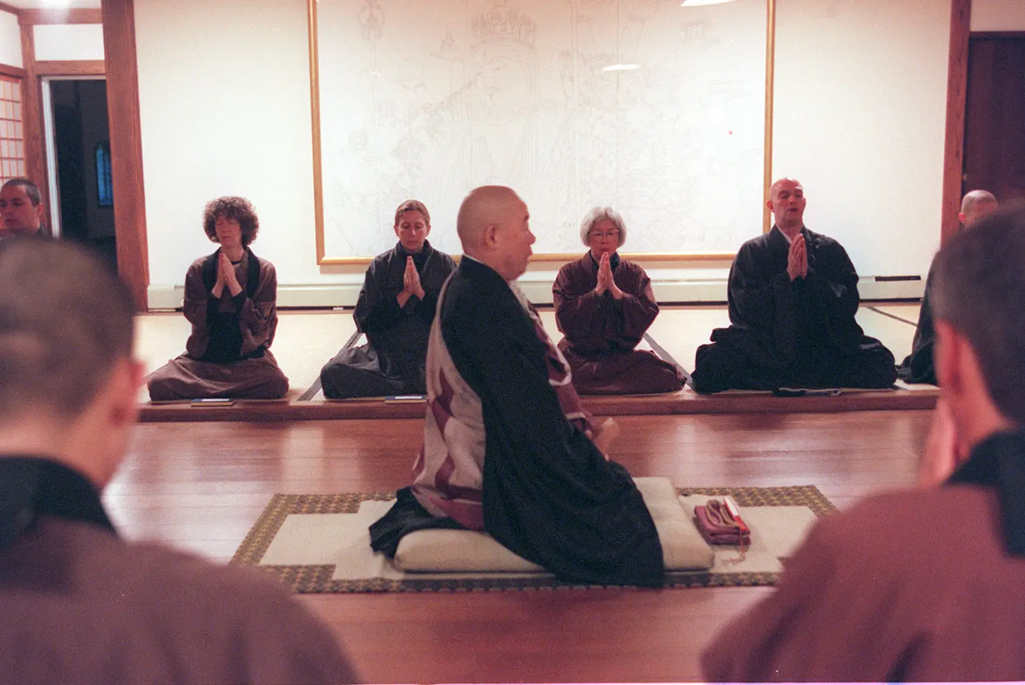 Eido Shimano liderou uma meditação noturna no Dai Bosatsu Zendo, um mosteiro zen-budista em Catskills, em 2001. (Crédito…Suzanne DeChillo/The New York Times)