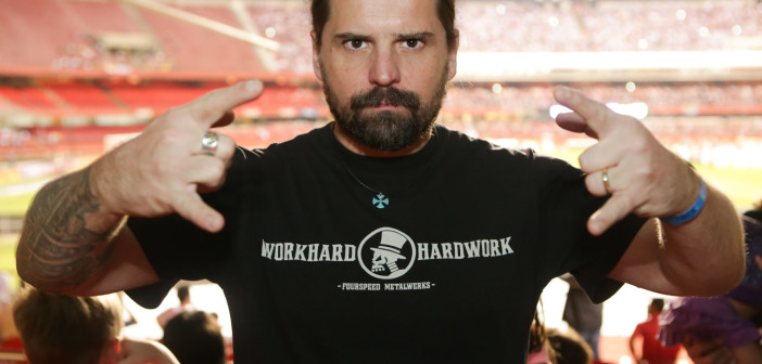 Andreas Kisser, guitarrista da banda Sepultura, fazendo graça com o sertanejo romântico Júnior, irmão da Sandy, com quem tocou Jimi Hendrix em show no Canecão