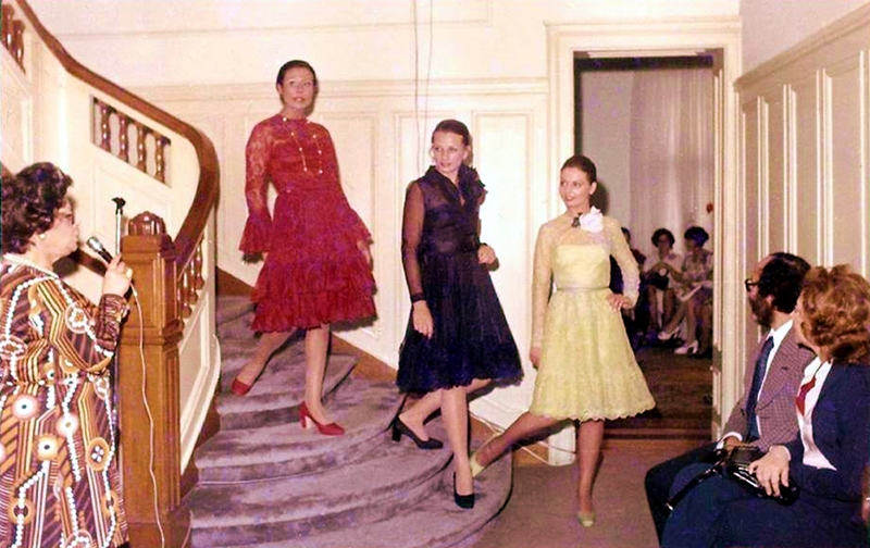 Na Maison de Mary Steigleder, Gilda Marinho anuncia as manequins, tendo na plateia a atriz Fernanda Montenegro e o comendador Luiz Carlos Lisboa. (Foto: Acervo de Herton de Leon)