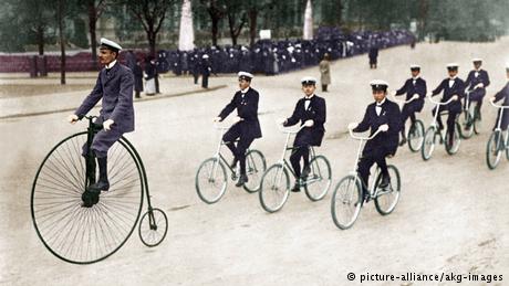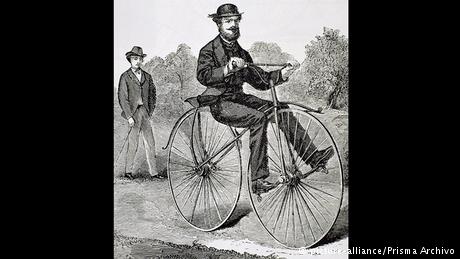 Em 1870, o inglês James Starley inventou a “Hochrad” (roda alta) Ariel. Graças ao mecanismo de impulsão da enorme roda dianteira, ela andava muito mais rápido, mas também era extremamente instável. Sozinho, não se podia subir nela. E, em caso de acidente, o condutor podia sofrer graves ferimentos.