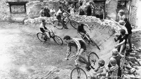 Para superar a triste rotina entre as ruínas após a Segunda Guerra Mundial, as pessoas tiveram de ser muito criativas. Não havia muitas possibilidades na Alemanha pós-guerra. Era preciso saber aproveitar o que havia à disposição. Na foto de 1953, crianças e jovens construíram um velódromo em Berlim usando restos dos escombros.