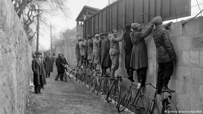 Esta foto foi tirada em Viena. Os homens se apoiam em suas bicicletas para assistir a uma partida de futebol. O mesmo aconteceu em Colônia em 2015 em Colônia, quando a banda AC/DC tocou em um campo. Centenas de pessoas assistiram ao show da cerca, sobre suas bikes.
