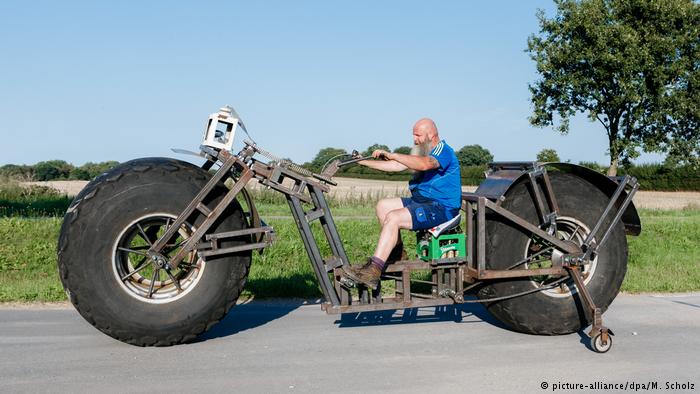 Frank Dose em sua bicicleta feita com rodas de trator