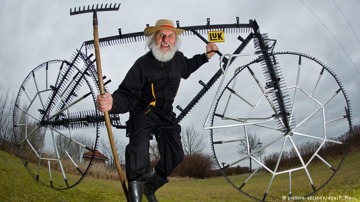 Designer Dieter Didi Senft com sua bicicleta feita de ancinhos