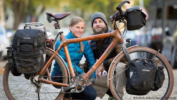 Bicicletas de bambu são tão estáveis, que aguentam voltas pelo globo. Karina e Tim Poser (foto) pedalaram de Hamburgo até Chengdu, na China. Estas bikes produzidas por meio de projetos de ajuda social em Gana e na Alemanha andam 12 mil quilômetros praticamente sem panes.