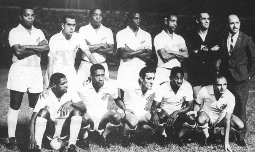 Formação do Santos na década de 60. Em pé, da esquerda para a direita: Lima, Zito, Joel Camargo, Haroldo, Geraldino, Gylmar e o jornalista Orlando Duarte. Agachados: Dorval, Mengálvio, Toninho Guerreiro, Pelé e Pepe (Foto: Divulgação)