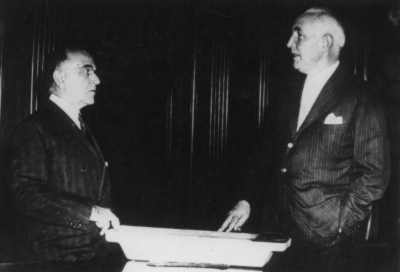 Américo Renê Giannetti entrega lingote de alumínio produzido em Saramenha, MG, ao Pres. Getúlio Vargas. Março/1945. (blogspot.com)