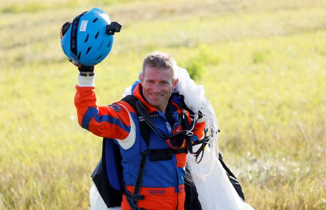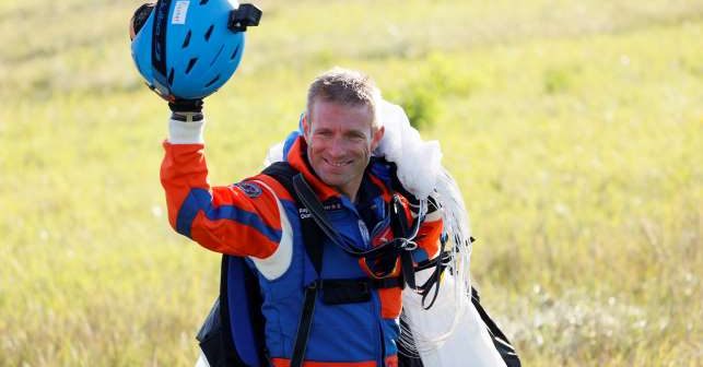 Saltando do avião protótipo de dois lugares, o paraquedista atingiu uma velocidade de 150 quilômetros por hora durante seu salto, pousando perto da base do projeto em Payerne.