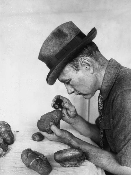 Roy Chapman Andrews examinando ovos de cerca de 10 milhões de anos encontrados durante expedição na Mongólia. (Imagem: Topical Press Agency/Getty Images)
