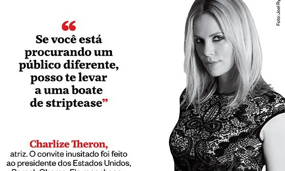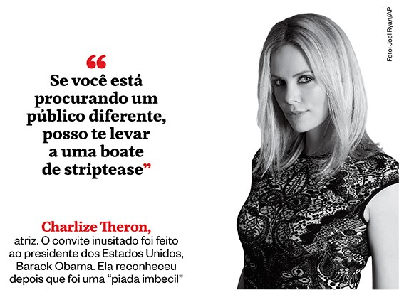 Charlize Theron, atriz. O convite inusitado foi feito ao presidente dos Estados Unidos, Barack Obama. Ela reconheceu depois que foi uma “piada imbecil”