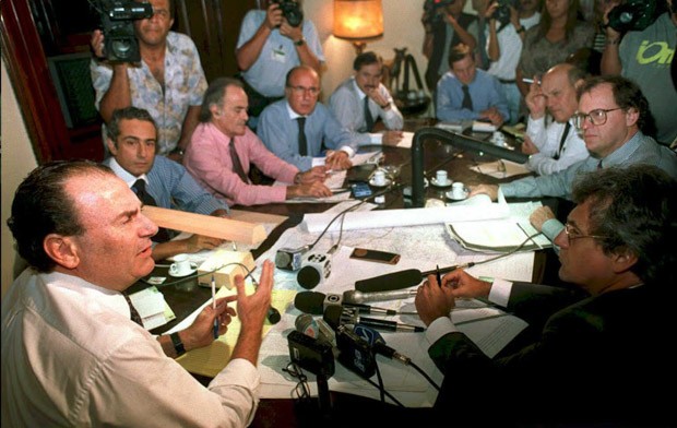 Sebastião do Rego Barros (primeiro à esquerda) durante negociação sobre a disputa pela fronteira de Peru Equador, no Palácio Itamaraty, em fevereiro de 1995 (Foto: Antonio Scorza / AFP)