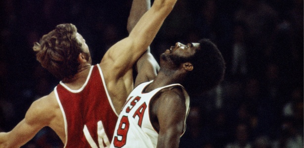 Alexsandr Belov (e) e Dwight Jones disputam bola durante final polêmica entre URSS e EUA nas Olimpíadas de 1972.