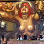 Três vezes maior – Vaidoso, presunçoso, exibicionista ao ponto de ser impossível distinguir os limites entre seu gosto pela publicidade e suas verdadeiras convicções, Siqueiros chegou mesmo a dizer que era “uma fusão de Karl Marx com Michelangelo”. E a corporificação desse pensamento ele tentou impor em “A Marcha da Humanidade”, um gigantesco conjunto de painéis destinados a exaltar “as revoluções populares do continente”. Siqueiros pintou-o já doente, num esforço prodigioso, num ritmo vertiginoso de trabalho. E ao completá-lo, u m complexo arquitetônico, escultórico e pictórico três vezes maior do que a Capela Sistina, anunciou orgulhosamente: “É o maior mural jamais pintado no mundo – pelo menos em tamanho”.