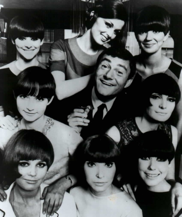 - Vidal Sassoon rodeado por modelos com os seus cortes de cabelos nos anos de 1960